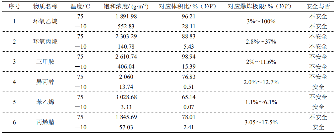 表1不同溫度下有機(jī)物飽和濃度安全性分析